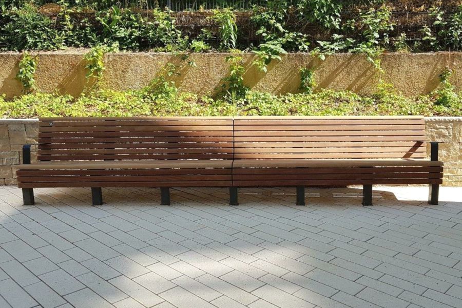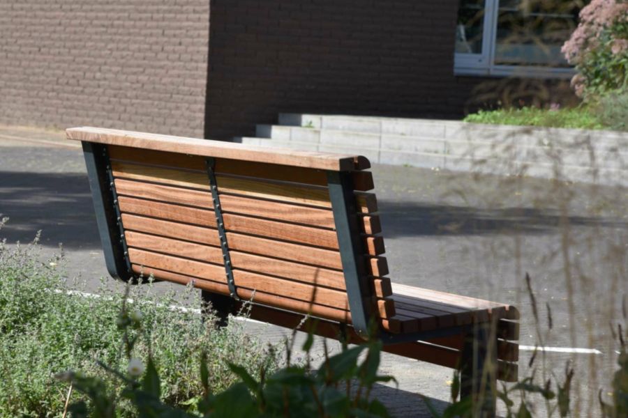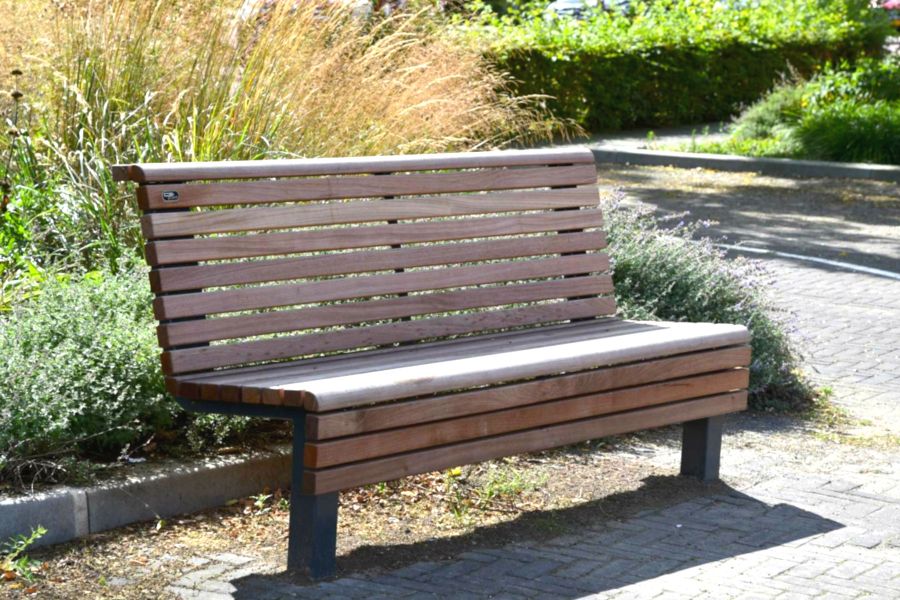 Edge bænken med sæde og ryglæn som en bølge ud i et. Stålrammen er diskret synlig gennem lamellerne. Det får det til at se ud, som om ryglænet er delt i to dele. Brugen af træ giver et varmt udseende til denne udendørs bænk og inviterer dig til at sidde på den. Afrundingen af sæde og ryglæn skaber en smuk flydende linje. Fås i 1800 mm eller 2200 mm bredde.