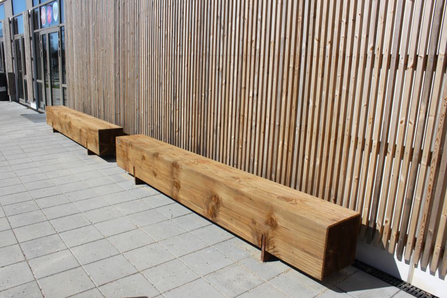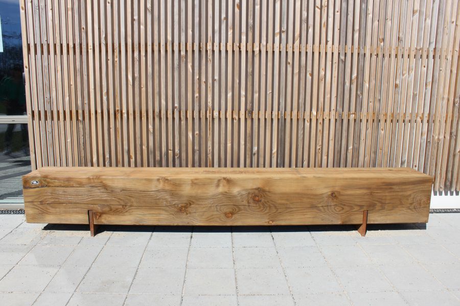 Douglas-træet har haft en særlig konserveringsproces. Dette er baseret på vakuumtryk, hvorved der bruges ingredienser, der kommer fra naturen og er 95% mineralbaserede. De imprægnerede elementer har øget holdbarhed og tilhører derfor holdbarhedsklasse 2/3. Basen på udendørsbænken er udelukkende lavet af cortenstål. Denne rene type stål har en rustfarvet "oxidhud", der forhindrer ilt i at nå det dybereliggende materiale. Dette bremser rustprocessen og forlænger levetiden.