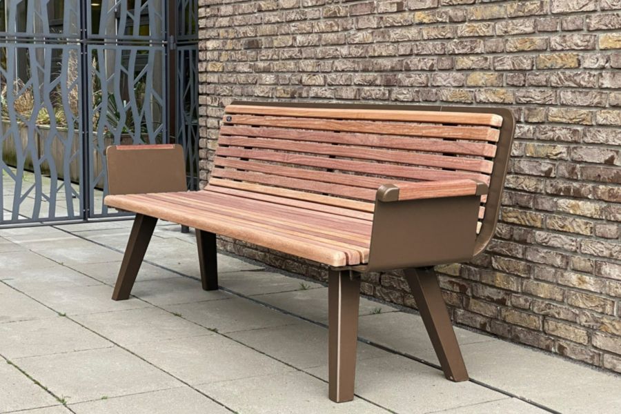 Retro bænken er varmgalvaniseret og to-lags pulverlakeret. Det gør, at bænken, ligesom de andre produkter, holder længe i offentlige rum. Sæde og armlæn er udført i hårdttræ. Dette træ er 100 % hentet fra FSC-certificerede skove. Det betyder, at træet blev høstet bæredygtigt og ansvarligt.