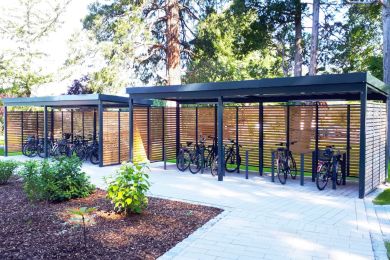 Cykelskure, åbne eller overdækkede cykelparkeringer, enkelte cykelstativer, cykelparkering i 2 etager eller aflåste cykelparkeringer - og selvfølgelig med bæredygtige grønne tage som fx sedum til fordel for biodiversiteten samt LAR-løsninger (Lokal afledning af regnvand).