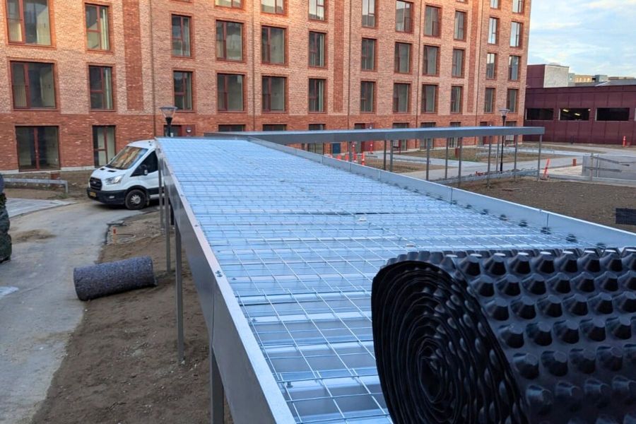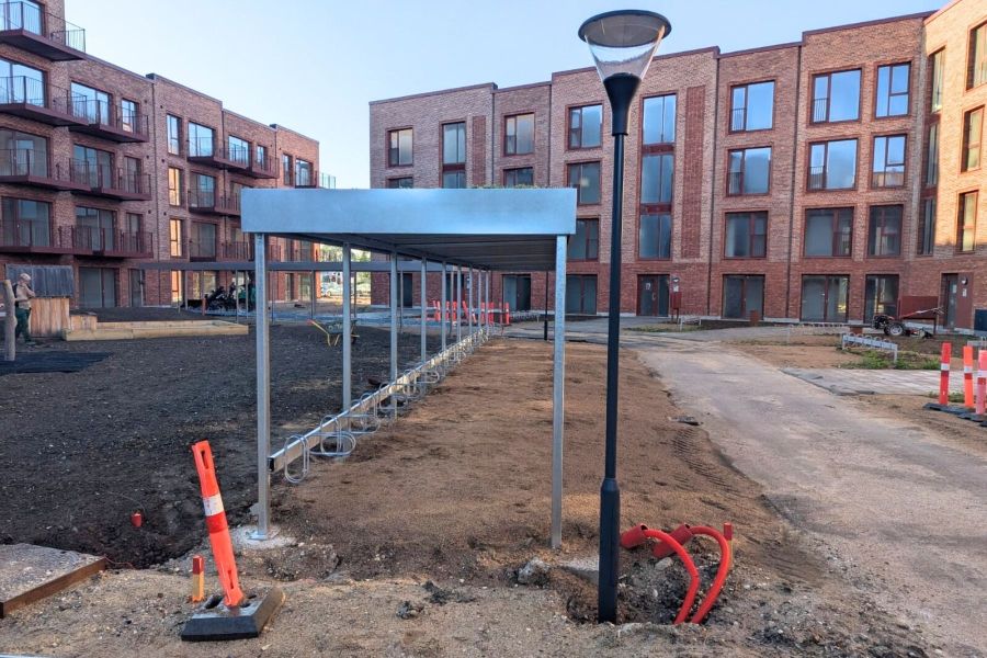 Som en del af helhedsløsningen kan der etableres overdækket cykelparkering eller komplette cykelskure baseret på robuste galvaniserede stålkonstruktioner.